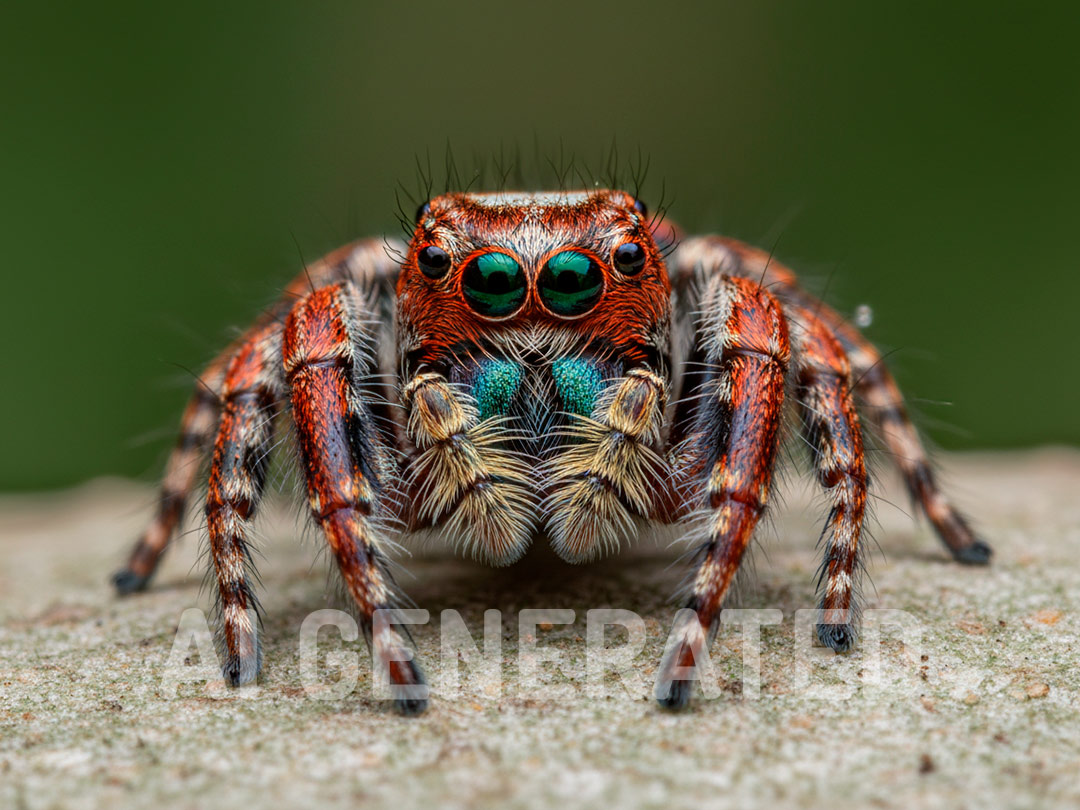 “Create a realistic frontal macro photograph of a jumping spider, similar in shape and color to the species Habronnattus americanus, with a magnification ratio of 2:1.”