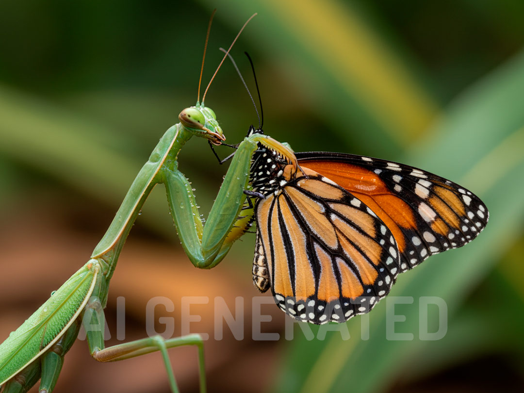 “Create a realistic macro photograph of a realistically depicted green praying mantis holding a realistic-looking butterfly of the African monarch butterfly (Danaus chrysippus) species with its two raptorial legs.”